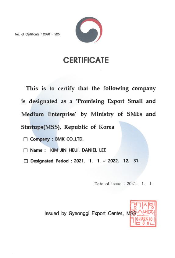 Promising Export Small and Medium Enterprise 페이지 정보 작성자 비엠케이 작성일21-01-22 10:56 조회3,220회 관련링크 이전글 다음글 목록 본문 'Promising Export Small and Medium Enterprise' by Ministry of SMEs and Startups(MSS), Republic of Korea 이전글 다음글 목록